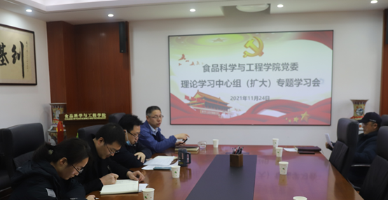会上,学院党委书记刘晓忠以“学习领会党的十九届六中全会精神 全面贯彻习近平新时代中国特色社会主义思想”为题,从全会基本情况、准确把握全会精神的精髓要义和领悟全会重大意义及贯彻落实全会精神等三个方面对党的十九届六中全会精神进行了解读。他指出,我们要把学习贯彻党的十九届六中全会精神作为学院当前和今后一个时期的重大政治任务,准确把握全会精神实质,把思想和行动统一到党中央决策部署上来;要深入认识《决议》的重大意义和深远影响,精心周密安排部署,组织党员干部、广大教师、团员青年深入学习领会,推动宣传贯彻走深走实、全会精神入脑入心。随后,与会人员围绕如何把党的十九届六中全会精神落地落实、推动食品学科建设提质增效和学院内涵式发展进行了讨论。