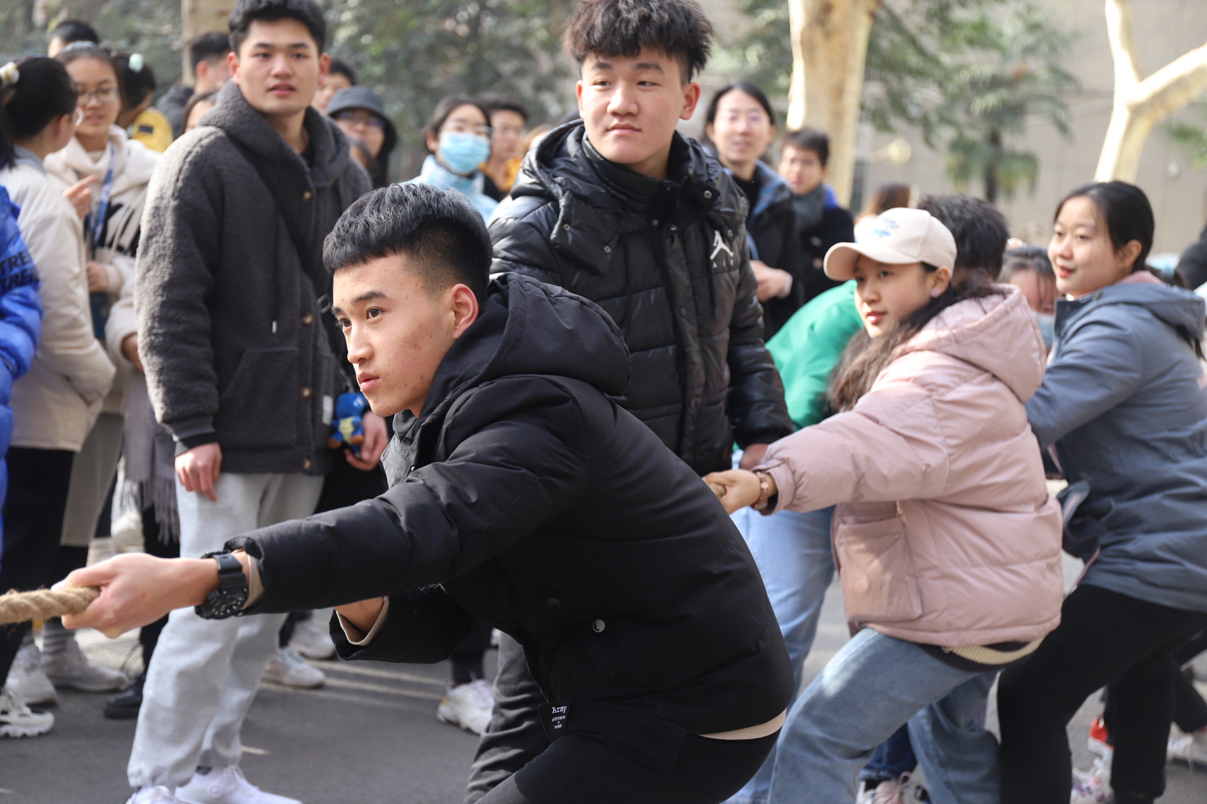 虽在十二月寒冬,但不论是参赛者还是拉拉队,都热情高涨。随着一声哨响,比赛正式开始,参赛队员们紧握长绳,卯足了劲拼命往后拉,未参赛的同学自发组队为比赛队员呐喊加油。哨子声、呐喊声此起彼伏,现场激烈的比赛将整个活动推向了高潮!队员们整齐划一的动作充分展现了班级的团结协作能力和体育竞技精神,为到场观看的师生们献上了一场精彩的视觉盛宴。