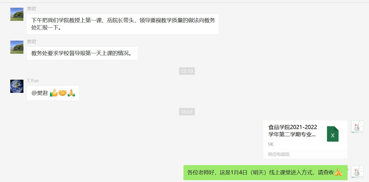 学院于1月3日顺利开展了2021-2022学年第二学期“第一课”。岳田利教授承担《食品工厂设计》课程第一讲,把思想政治教育元素紧密融入专业课讲授;课堂上,岳老师课上观点鲜明、视野开阔、主题明确,课程具有很强的前瞻性和启发性,牢牢抓住了同学们的注意力。课后,岳老师提到:“网络授课比起课堂授课,要求老师有更高的热情”。在备课时不仅要熟悉授课内容,还要考虑各种方法来提高学生学习的兴趣。因此,需要丰富课堂教学资源,增加更多动静结合的图像、视频等,提高学生的专注度。对于教学内容抽象、学生难以理解的部分,需要运用更多的多媒体来进行教学。赵祎辅导员在《形势与政策》课程中给学生做了《推动构建人类卫生健康共同体》专题讲座,赵老师表示“近期西安疫情是同学们关注的焦点,本次课程特别给同学们讲解了中国为全球抗疫做出的贡献、团结全球抗疫的中国方案,增强了同学们抗击疫情的信心和决心,树立爱国、爱党的坚定立场,在纷繁复杂的国际形势中坚定理想和信念”。学院同时要求课程负责人,认真组织课程组老师开展组内相互听课和集体备课机制,逐步提高教学质量。