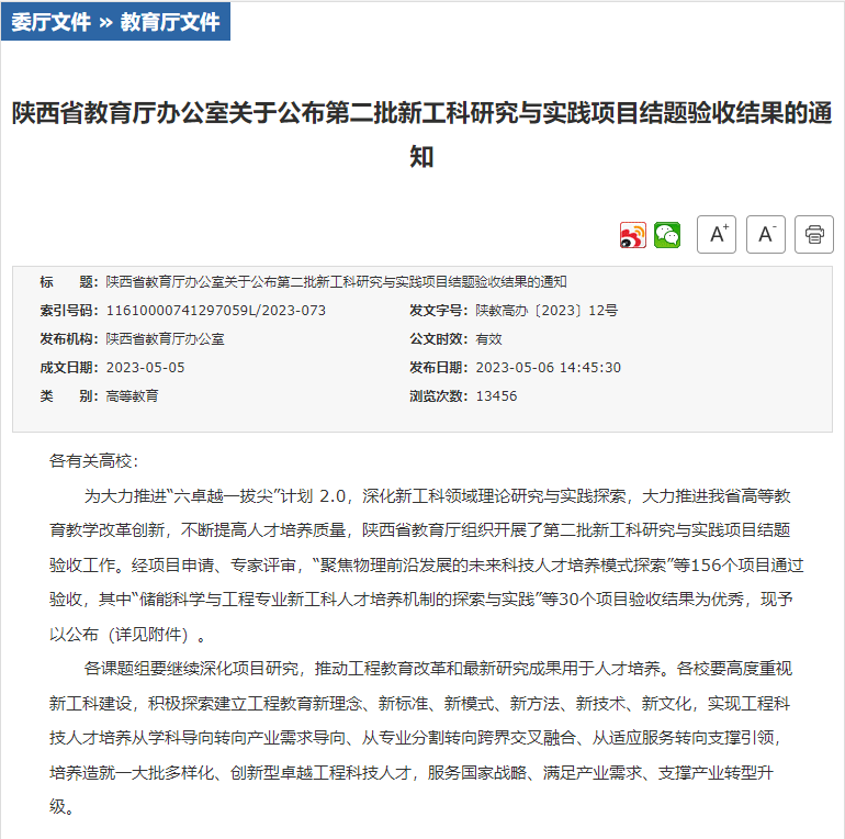 5月5日,陕西省教育厅发布了《陕西省教育厅办公室关于公布第二批新工科研究与实践项目结题验收结果的通知》(陕教高办〔2023〕12号),由永利官网曹炜教授主持,吕新刚、高慧、程妮、欧建东、张颖、曹悦、刘茜、刘清清、何亮亮等老师参加的“基于“云工坊”模式的食品学科产教融合创新实践平台建设探索与实践”项目顺利通过结题验收。
