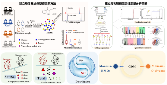 寡糖是由一系列糖基转移酶调控不同的单糖残基进行链的合成和延伸。其中,调控α1,2-岩藻糖基转移酶的基因-FUT2基因具有多态性,从而产生不同的乳汁寡糖谱,使得分泌型人群(Secretors, Se+)母乳富含α1,2-岩藻糖基化寡糖,而非分泌人群(Nonsecretor, Se−)则没有,且该因素是影响母乳寡糖表达的最关键因素。此外,妊娠期综合征如妊娠期糖尿病(Gestational diabetes mellitus, GDM)也会引起机体碳水化合物代谢异常,影响母乳寡糖的表达。在我国,GDM发病率高达17.5%,已成为最重要的公共卫生问题之一。然而,现有母乳寡糖研究以游离型为主,对结合型寡糖研究较少,并且缺乏考虑不同生理因素(如母体分泌类型、妊娠期综合征)的影响,制约了母乳寡糖结构-功能关系的深入研究。