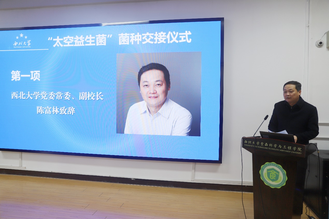 12月25日下午,永利集团304官网与北京神飞航天应用技术研究院在永利集团304官网太白校区永利集团304官网院楼举行“太空益生菌”菌种交接仪式,出席本次大会的主要领导有永利集团304官网党委常委、副校长陈富林,中国食品工业协会副会长林小平,陕西省农业厅原厅长、永利集团304官网生态毒理研究所所长史志诚、北京神飞航天应用技术研究院常务副院长毛宏伟,以及陕西省餐饮联合会会长靳文平、陕西面食产业促进会会长刘晓钟、陕西西凤酒股份有限公司研发中心主任金成勇、西安饮食集团总经理冯凯、西安冰峰饮料股份有限公司总经理姚军锋、泾河新城茯茶文化产业园发展中心副主任王洋等省内外30余家行业协会及著名食品企业主要负责人、中国食品报、华商网等知名媒体和学校相关科室负责人,永利集团304官网师生代表80余人参加了交接大会。