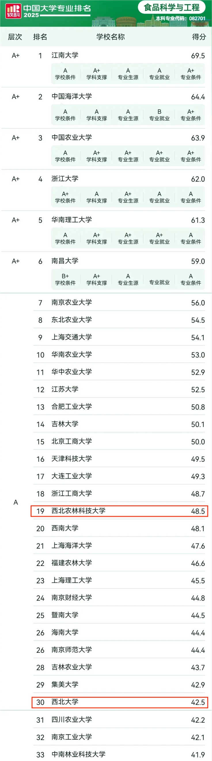2025年6月18日,高等教育专业评价机构软科发布“2025软科中国大学专业排名”。在全国院校参评的食品科学与工程专业中,永利集团304官网再次入围,首次列陕西高校第二,仅次于西北农林科技大学,学科建设实力不断提升。