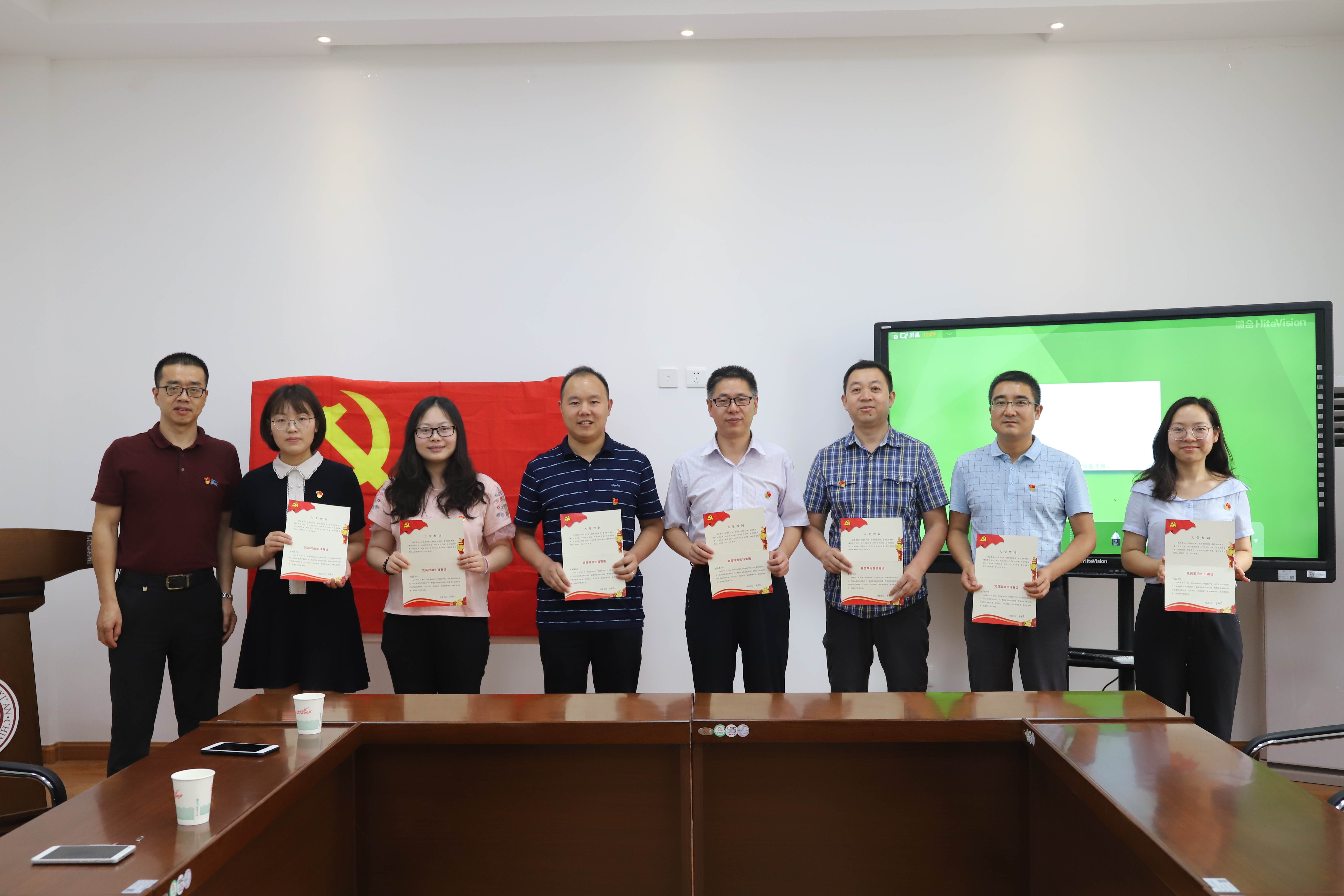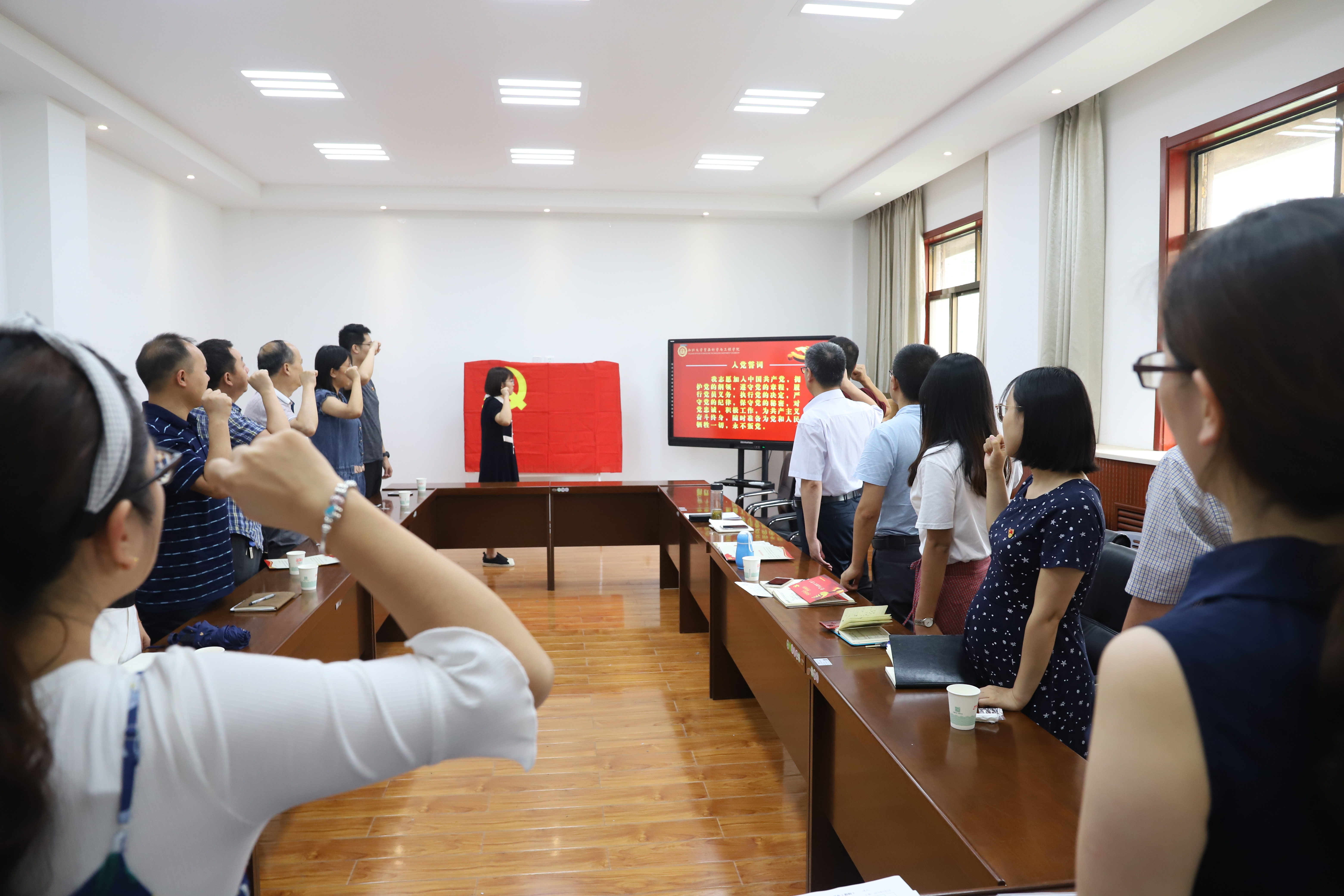 随后,欧建东副书记为6、7月入党的7名同志颁发了党员政治生日贺卡,师生党员代表发表了生日感言,他们深情回顾了自己加入中国共产党的初衷,并结合自身情况,分享了在实际工作生活中如何以一名共产党员身份践行入党誓词的点滴,表达了在今后工作中将不忘初心、牢记使命,尽己所能,全力以赴对党和国家教育事业的责任、忠诚与担当。接着,全体师生党员高举右手,紧握拳头,重温入党誓词,接受心灵净化和精神洗礼,提醒自己不忘入党初心的铮铮誓言。