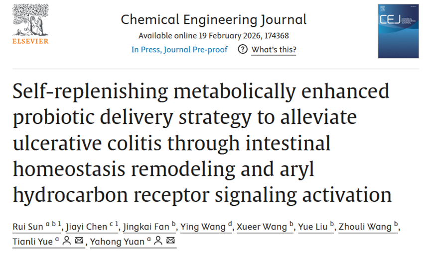近期,永利官网岳田利、袁亚宏教授团队在国际期刊《Chemical Engineering Journal》(Q1, IF: 13.2, 中科院1区Top) 发表题为“Self-replenishing metabolically enhanced probiotic delivery strategy to alleviate ulcerative colitis through intestinal homeostasis remodeling and aryl hydrocarbon receptor signaling activation”的研究性论文。该研究得到了国家自然科学资金(32372348、32172301)的支持。论文通讯作者为永利集团304官网岳田利教授和袁亚宏教授。